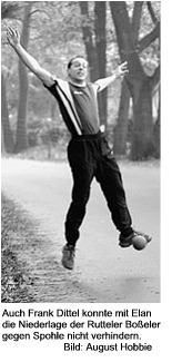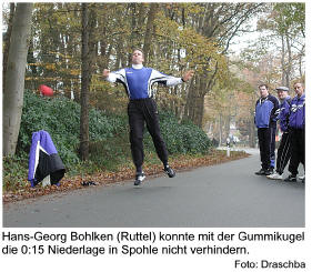 In der Bezirksliga Süd-Ost geht das „Kopf-an-Kopf-Rennen“ weiter.ng Wesermarsch. Positiv präsentierten sich die Boßelteams aus den Kreisverbänden Butjadingen und Stadland in den Ligen des Landesverbandes Oldenburg. Elf Siegen und einem Unentschieden standen nur drei Niederlagen gegenüber. Auch zwei Kreisduelle standen dabei an. Kreuzmoor musste die erste Saisonniederlage einstecken. Männer, Landesliga: Westerscheps – Kreuzmoor 14:5. Kreuzmoor wurde von seinem Höhenflug in den ersten drei Wettkämpfen nun deutlich auf den Boden der Tatsachen zurückgeholt. Mannschaftsführer Michael Backhaus kritisierte hart: „Die Leistung einiger Sportler hätte maximal für eine Kohlfahrt gereicht.' Damit konnte der Gastgeber nicht gefährdet werden. Die Ausnahme bildete die erste Gummigruppe, die mit fünf Schoet und 13 Metern, bei einem Durchgangsergebnis von 12,1 Durchgängen, ein gutes Ergebnis erzielte. Die Niederlage der anderen drei Gruppen lauteten: Erste Holzgruppe: drei Wurf und 21 Meter, zweite Holzgruppe: 6/107 und zweite Gummigruppe: 4/147. Mit 5:3-Punkten befindet sich Kreuzmoor nun auf Rang vier der Tabelle. Verbandsliga Süd-Ost: Nach dem 6:2-Erfolg in Langendamm/Dangastermoor führt Reitland verlustpunktfrei mit 8:0-Zählern die Tabelle an. Die Mitkonkurrenten um die Tabellenspitze, Altjührden und Stapel, gaben erstmals Punkte ab. Aufatmen konnte Schweewarden, dessen klarer 8:2-Sieg gegen Stapel gleichzeitig erster Saisonerfolg war, womit die „Rote Laterne“ an den Vizemeister der vergangenen Saison, Haarenstroth, abgegeben wurde, das sensationell zu Hause mit 3:5 gegen Aufsteiger Halsbek II verlor. Bezirksliga Süd-Ost: Einen Kantersieg gelang Waddens mit dem 23:0-Erfolg gegen den Tabellenletzten Obenstrohe. Mit jeweils 8:0-Zählern führen Rosenberg (besseres Schoetverhältnis) und Waddens die Staffel an, wobei es am Sonntag, 1. Dezember, in Rosenberg zum Spitzenspiel kommt. Auch Mentzhausen (10:1-Sieg gegen Langebrügge) darf mit Platz drei und 5:3-Zählern zufrieden sein. Bezirksklasse Süd-Ost: Moorriem bezwang Specken, das bislang eine weiße Weste besaß, deutlich mit 6:1. Da Aufsteiger Reitland II mit 12:10 gegen Grünenkamp ebenfalls den ersten Saisonerfolg verbuchen konnte, schöpfen beide Teams wieder Hoffnung im Abstiegskampf. Frauen, Landesliga: Westerscheps – Kreuzmoor 0:8. Die Frauen aus Kreuzmoor machten es besser als die Männer. Durch diesen Erfolg befindet sich Kreuzmoor auf dem für sie ungewohnten dritten Tabellenrang mit 6:2-Punkten wieder, nur einen Zähler hinter dem Duo aus Schweinebrück und Halsbek. Die Holzgruppe ging schnell in Führung. Bei der Wende betrug der Vorsprung schon sechs Wurf, und am Ende siegte man mit sechs Schoet und 55 Meter. Etwas spannender lief es für die Gummigruppe, die sich mit zwei Schoet und 31 Meter durchsetzte. Die Partie Zetel-Osterende gegen Reitland wurde wegen des Zeteler Marktes auf Sonntag. 15. Dezember, verlegt. Verbandsliga: Im Kreisduell setzte sich Waddens knapp mit 3:0 gegen Stollhamm durch. Waddens nimmt zusammen mit Bohlenberge und Wiefels (alle 6:2-Punkte) eine Spitzenposition ein. Stollhamm (2:6) befindet sich vorerst am Tabellenende. Bezirksliga Süd-Ost: Spannend geht es in dieser Staffel zu. Nach dem knappen 2:0-Erfolg in Rosenberg ist Delfshausen (6:2-Punkte) Zweiter hinter dem punktgleichen Team aus Torsholt. In einer guten Ausgangsposition befindet sich auch Moorriem (5:1-Punkte) nach dem 7:0-Sieg gegen Esenshamm. Augusthausen besiegte Schlusslicht Hollwege klar mit 7:0. Für Augusthausen und Moorriem steht noch eine Nachholbegegnung an. Reitland II durfte mit dem 1:1-Remis gegen Spitzenreiter Torsholt zufrieden sein. © / Quelle: Wilhelmshavener Zeitung / bereitgestellt am 12.11.2002 Favoriten behaupten sich am Wettkampftag Spohle erfolgreich gegen Ruttel / Halsbek siegt in Cleverns Neustadtgödens noch ohne Verlustpunkt